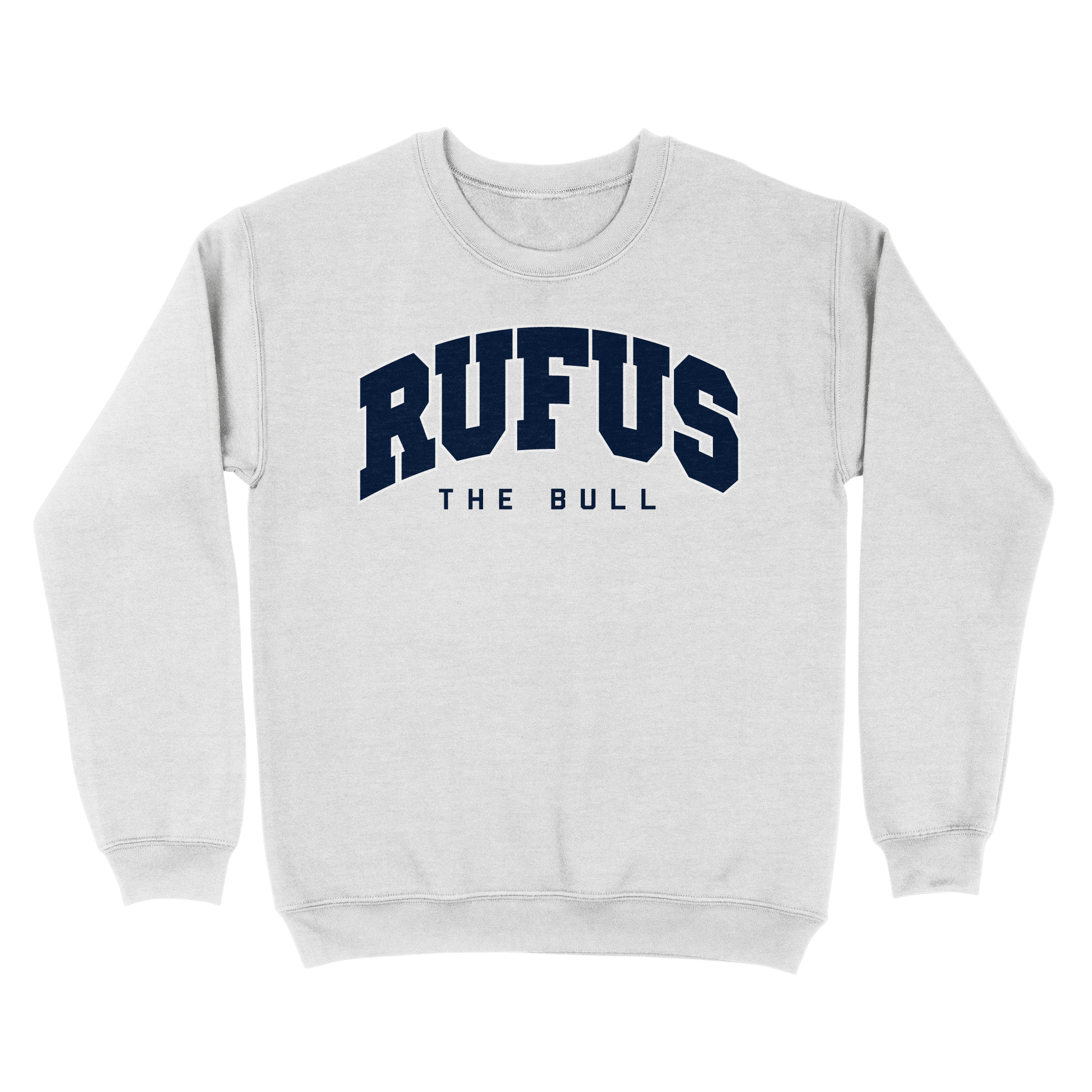 Represent the farm in classic style with our Collegiate Rufus Crewneck! This super-soft, crisp white sweatshirt features the iconic 'RUFUS THE BULL' logo in a bold, timeless navy blue varsity font. It’s a clean, simple, and comfortable way to show your loyalty. Perfect for chilly evenings or cozy weekends!